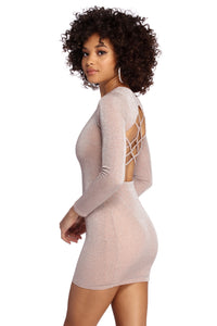 Make it a glitzy affair to remember in this natural glam mini dress! It features a crew neckline, fitted long sleeves and a bold open back with a mini lattice design. Dress is composed of a natural hued glitter knit fabric that offers a form hugging fit that shines from all your best angles!