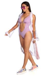 Go above and beyond being extra in this multi color glitter robe! Get draped in fabulous-ness with a faux fur trim, an open front, and a relaxed fit. Robe is composed of a sheer, rainbow mesh fabric with all over gold glitter.Model is 5'7 with a 34" bust, 24" waist, and 36" hips. She is wearing a size small.