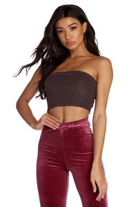 Add a little glow to your midnight attire! This mauve, tube top has a cropped hem paired with a fitted appearance. The garment is composed of a thin knit that offers plenty of stretch and features an all over glitter detail! May leave a trail of fairy dust.
