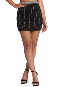 Heat up the scene with this dazzling heat stone mini skirt! It features a high rise fit, a glitter elastic waistband, and a short, form hugging fit. The black mini skirt is composed of a stretchy knit fabric and is embellished with sparkling heat stones in straight line patterns on both the front and back.