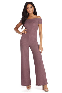Let it shine, let it shine! This sparkling mauve formal jumpsuit will have you feeling like the star of the show. It features an elastic off the shoulder neckline with short sleeves, a slim fitting bodice with a high waist seam, and wide pant legs for a classy look. Jumpsuit is composed of a glitter knit fabric that offers a moderate stretch.Glitter may spread.