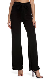 Shine so fine in these glitter knit pants! They feature a high rise waist, a cute tie front accent, and wide pant legs. The bottoms are composed of a black glitter knit fabric that offers plenty of stretch.