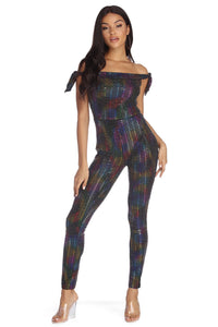 Your presence will be magical in this sparkling rainbow jumpsuit! It features an off the shoulder neckline with tie sleeves, a slim fit, and tapered pant legs. Jumpsuit is composed of a knit fabric with rainbow glitter all over, and offers plenty of stretch.