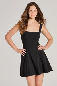 This sleeveless crepe mini dress features a square neckline, a lace-up back that attracts attention, and a flattering A-line silhouette. Perfect for the school dance or a dressy date night.