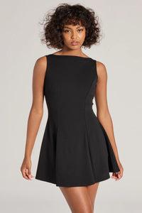 A timeless boat neck crepe skater dress in a sleeveless design with a short-length hem perfect for styling with boots or heels.