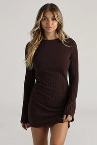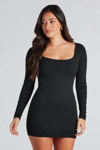 A casual mini dress that's sure to become your fashion muse! The mini-length dress features fitted long sleeves, a scoop neckline, a built-in shelf bra for extra support, and a flattering bodycon silhouette on stretchy rib knit fabric. Complete the look in a moto jacket and boots for day or evening plans!