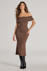Showcase a sleek silhouette in this ribbed knit midi dress featuring an off-the-shoulder neckline with a fold-over design and a mermaid silhouette to highlight your curves. Style with knee-high boots for a chic look.