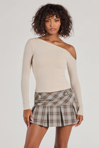 Cozy and on-trend, this ribbed hacci knit top features an asymmetric off-shoulder neckline with long fitted sleeves and a mid-length hem with a form-hugging fit. Style with a plaid skirt and ankle booties!