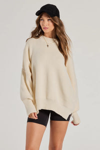 Comfy and cozy, this ribbed knit sweater features a mock neckline, long dolman-style sleeves, short side slit accents, and the perfect oversized fit. Pair with biker shorts for a casual look, or a faux leather mini skirt for a dressier vibe.
