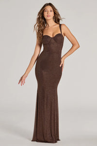 A glitter formal dress features a cold shoulder neckline, a sheer bodice trim, and a striking floor-length mermaid silhouette. Perfect for homecoming, banquets, or galas.