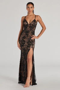 Gorgeously intricate, the Elodie formal dress is crafted with sheer floral lace fabric with lining and glamorous sequin and beaded embroidery for a luxe look. It features a sleeveless V-neckline with a padded bust, adjustable spaghetti straps to find your customized fit, and a floor-sweeping mermaid silhouette accented with a high-cut front slit.