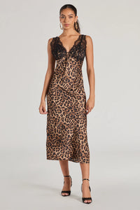 This sleek leopard print satin midi dress is designed with a sheer lace bust overlay for a sexy-chic vibe. It features a sleeveless V-neckline with a tie-front detail, tank shoulder straps, and a midi-length hem with a flowy A-line silhouette.