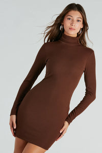 Soft and lightweight ribbed knit fabric crafts this trendy mini dress perfect for styling day to night! The mini-length dress features fitted long sleeves, a folded turtleneck, and a flattering bodycon silhouette on double-lined ribbed knit fabric. Complete the look in an oversized blazer and boots for brunch downtown or date night!