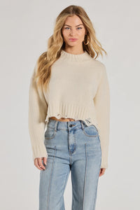This cute and trendy ribbed knit sweater features a mock neckline, long dolman-style sleeves, and a distressed cropped hem with a relaxed fit. Perf for everyday, pair with high-rise jeans and sneakers.