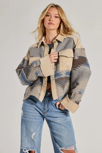 Layer on the western trend with this cozy woven shacket designed with a geometric pattern, a corduroy trim, and distressed seams and hems. It features a collared neckline, long sleeves with buttons to cuff, a button-down front, and the perfect relaxed fit.