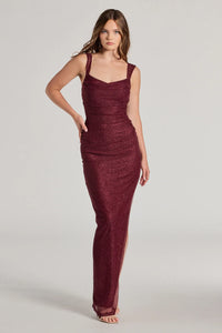 Shine bright in the glamorous Amora glitter mesh high slit column dress boasting a fitted silhouette and floor-length hem that makes an entrance.