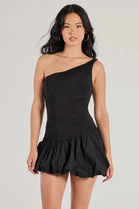 Serve trendy vibes at your next party in this cute skater dress featuring an asymmetric one-shoulder neckline with a twisted tank strap, ruching to accentuate your curves, and a short ruched bubble hem for that flirty flair. Style with platform heels!