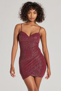 You're in for a glam night in this glitter mini dress flaunting a sultry V-neckline that leads to the faux wrap bodycon silhouette that shows off your curves. Pair with earrings.