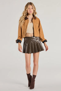 Uncover a chic look for trips to the city in this faux leather pleated mini skirt with a trendy belted waist that makes a statement. Pair with a cropped jacket.