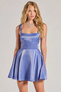 Shimmer in this sleeveless short dress featuring a stunning lace-up back, hidden side pockets for keeping your hands warm, and a flirty A-line silhouette. Perfect for the school dance or a celebration.