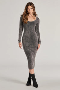 This ribbed knit midi dress is designed with a cotton-blend fabric with a cool mineral wash offering plenty of stretch. The dress features a scoop neckline, long fitted sleeves, and a midi-length bodycon silhouette to show off your curves.