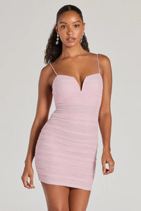 Sparkle and glow in this glitter mesh mini dress featuring a wired V-neckline, sleek bungee spaghetti straps, and side ruched seams that accentuate your curves along the bodycon silhouette. Perfect for the school dance or a birthday.