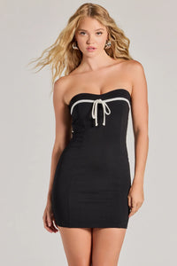 Seal your style with this charming ponte mini dress featuring an adorable strapless sweetheart neckline with a bow and a bodycon fit. Style with earrings.