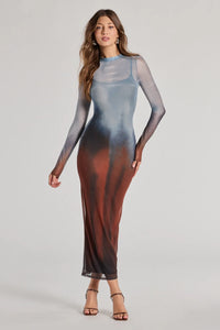 Showcase a sultry silhouette in this sheer mesh midi dress designed with a multi-colored abstract print for a bold vibe. It features a mock neckline with long fitted sleeves, a bodycon silhouette to hug your curves, and a full-length knit lining with a scoop neckline and spaghetti straps.