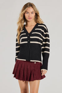Elevate your cozy looks with this classic striped ribbed knit cardigan designed with a chic oversized silhouette. It features a V-neckline with a button-down front, long sleeves with tapered hems, and a mid-length relaxed fit to pair with pleated mini skirts and knee-high boots.