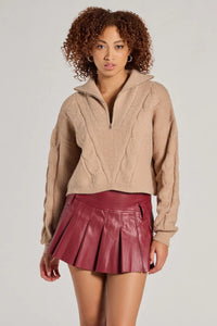 Keep it preppy and chic with a faux leather mini skirt that features a mid-rise waist and playful pleats. Complete outfit with statement cardigan and boots!