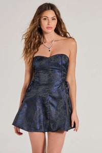 Showcase a chic romantic aura in this floral satin jacquard skater dress featuring a strapless sweetheart neckline, flexible boning at the bodice for added structure, and lace-up sides for a snatched silhouette. The short skater skirt adds a sweet feminine vibe to the stunning style.