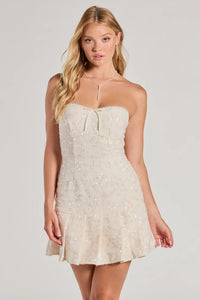 The Adalynn sequin mini dress features a flattering square neckline, adjustable spaghetti straps, and a lace-up back that will turn heads. The bodycon silhouette is finished with a front slit and a mini-length hem. The luxe sequin embroidered scroll pattern will elevate the glam factor of your formal look.