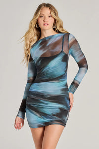An abstract print mesh mini dress features sheer fitted long sleeves, a boat neckline, and a flattering bodycon silhouette. Perfect for a party or gallery opening.