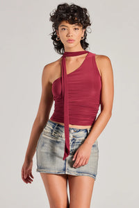 Chic and so on-trend, this stretchy knit top features an asymmetric one-shoulder neckline with an attached neck tie for that it-girl vibe. The front ruching will accentuate your curves on the fitted midi-length silhouette.
