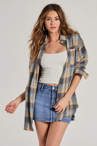 This plaid flannel top features a collared neckline with a button-down front, long sleeves you can cuff, a frayed hem, and the perfect oversized fit. Layer this casual staple over a basic top with denim!