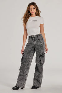 These on-trend cargo acid wash jeans feature a high-rise waist, cool zippered pockets at the front and cargo pockets on each side, and a straight-leg silhouette offering a laidback relaxed fit. Style with a graphic tee and booties!