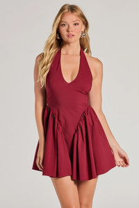 Bring a cute vibe to brunch or a party in this halter skater dress showcasing a deep V-neckline and a pleated silhouette for flirty flare. Pair with earrings.