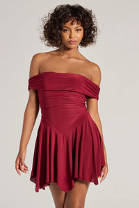 An off-the-shoulder dress features side ruched seams that accentuate your curves along a skater mini-length silhouette with an uneven hem. Perfect for the school dance or a party.