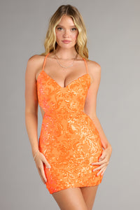 Get ready to make a stunning impact in this floral sequin mini dress at prom or a party! With a square neckline and adjustable satin spaghetti straps, this dress is designed to flatter your figure. The lace-up satin back adds a touch of elegance while the bodycon fit and mini-length hem show off your curves. Complete the look with a clutch, jewelry, and heels!