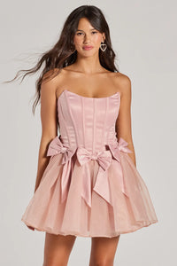 Jaimie Strapless Corset Bow A-Line Party Dress Jaimie Strapless Corset Bow A-Line Party DressSpecial Occasion A perfect night requires a perfect party dress like the Jaimie A-line dress to make your memorable entrance at the school dance, birthday, or dressy event! The party dress is crafted from a satin-lined bodice that leads to her organza woven skirt with tulle and a stretchy knit lining giving a voluminous effect. She boasts a strapless neckline and flexible boning inserts to provide a flattering fit, while the satin bows along the waist add a charming touch. The A-line silhouette and pleated short-length hem create a unique and playful look. Compliment your look with earrings, a bracelet, and heels! Fit & Features - Satin-lined bodice, organza woven skirt, tulle and stretchy knit lining