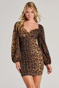 Untamed Glamour Leopard Print Long Sleeve Mini Dress Untamed Glamour Leopard Print Long Sleeve Mini DressFab and fierce, this untamed mini bodycon dress makes every head turn. It features chic balloon long sleeves and flattering side ruching to enhance your curves. Style with earrings. Fit & Features - Mesh fabrication, moderate stretch