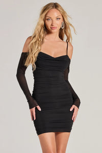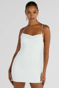 Giving disco diva with a dash of sultry! This glitter mini dress brings the heat with a draped cowl neckline and curve-hugging ruching—aka, the dress that does all the flirting for you.