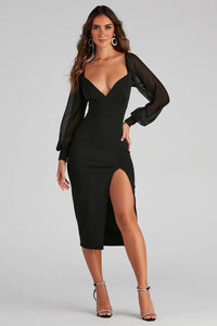 Step out in a formal dress that is perfect for your cocktail events! Trista features a plunging V-neckline, long chiffon sleeves, a high side slit, and a midi-length silhouette. The dress is composed of a lined crepe fabric that offers a form hugging fit with a moderate stretch. Complete look with pumps and a rhinestone choker.