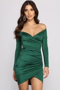 Feel oh-so-luxe in this gorgeous curve-hugging mini dress! It features an off-the-shoulder neckline with a wrap front, long fitted sleeves, ruched detailing, and a mini-length silhouette with a tulip hem. Pair this dress with sparkly hoop earrings and a sleek clutch for an elevated night-out look.