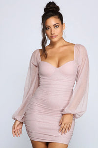 This glitter mesh bodycon dress will have you looking gorgeous and glitzy for every party! It features a sweetheart neckline, long sheer bishop sleeves, ruched detailing to enhance your natural curves, and a short, form-hugging silhouette. Style this dress with rhinestone earrings and heels.