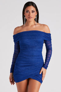 Razzle and dazzle all night in this glitter mesh mini dress to sparkle at every party! The dress features a foldover off-the-shoulder neckline, ruched long fitted sleeves, and ruched side seams that hug your curves along the bodycon mini-length hem with a faux wrap-front design. The sheer glitter mesh fabric includes a smooth sewn-in knit lining. Complete the look with platform heels.