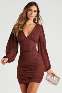 Shine the brightest this season sparkling in this glitter mesh party dress! It features slightly sheer peasant long sleeves, a sexy plunge V-neckline, ruched side seams that hug your curves along the bodycon silhouette, and a mini-length hem. Complete the look in statement earrings and strappy heels for a dressy celebration!