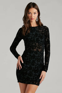 Have a flawless look that will radiate chic vibes all night in this sheer velvet flocked mini dress. It features a sheer mesh bodice with a partial knit lining at the bust, a crew neckline, long fitted sleeves, a sheer waist insert, a mini-length hem, and a bodycon silhouette that will hug your curves. The sheer mesh fabric features an all-over floral velvet flocked pattern and includes a knit skirt lining. Complete your look with a pair of strappy stilettos.