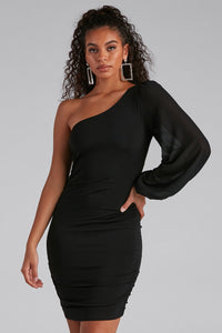 Create a head-turning look with a mini dress that makes a stunning entrance! The dress features a one-shoulder neckline, a long sheer balloon sleeve, ruching, and a mini length silhouette. The dress is composed of a lined lightweight woven fabric that offers a form hugging fit with minimal stretch. Complete look with stiletto heels and a faux leather clutch.