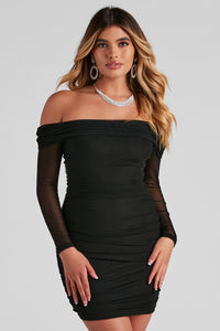 Mesmerize in this stunning mesh bodycon dress! It features an off the shoulder sweetheart neckline, lined and padded cups with sheer mesh fabric, long fitted sheer mesh sleeves with ruched detailing, a high waist, and a mini length, curve-hugging silhouette. Pair this dress with a rhinestone choker necklace and strappy heels.